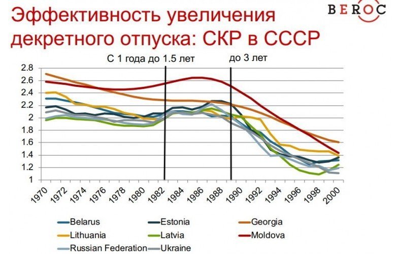 Катерина Борнукова продемонстрировала диаграммы, на которых было показано влияние роста декретных отпусков на рождаемость. После того, как в СССР декретный отпуск в 1982 году был увеличен с 1 года до 1,5 лет, рождаемость действительно подскочила. Однако после продления данного отпуска в 1989 году до трех лет, данного эффекта наблюдать не довелось, возможно, из-за экономических проблем «лихих 90-х».