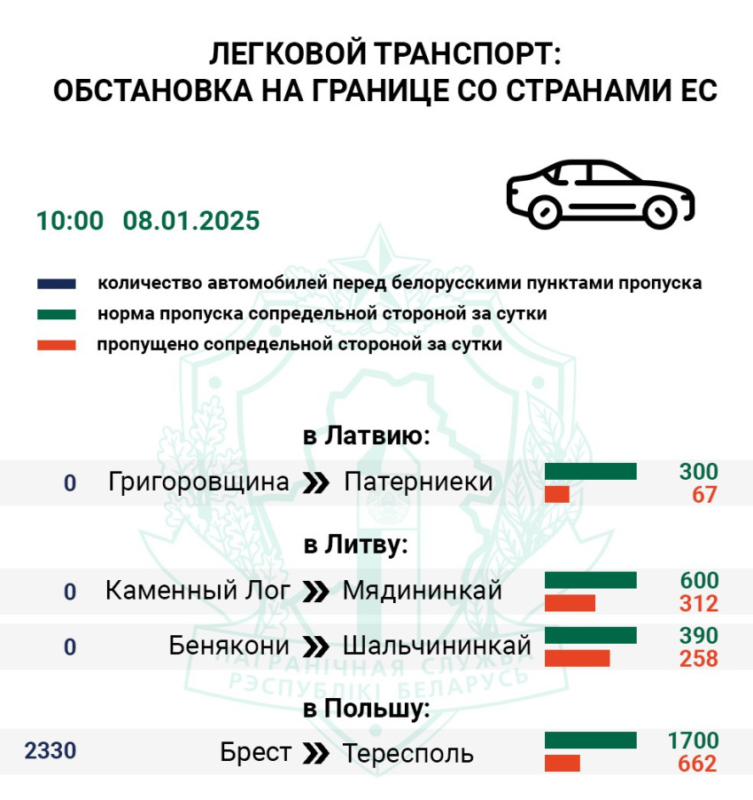 8 января Госпогранкомитет сообщил, что перед пунктом пропуска „Тересполь“ („Брест“) въезда в Польшу ожидают более 2,3 тыс легковушек и 55 автобусов. «Критическая ситуация сохраняется на протяжении нескольких дней», - отмечает ведомство.