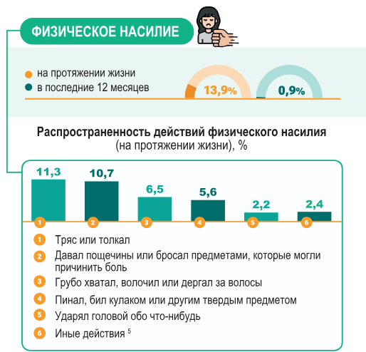При этом 13% женщин подвергалось экономическому насилию со стороны партнера, когда он не давал деньги на дом и детей, запрещал женщине работать или отбирал ее деньги.