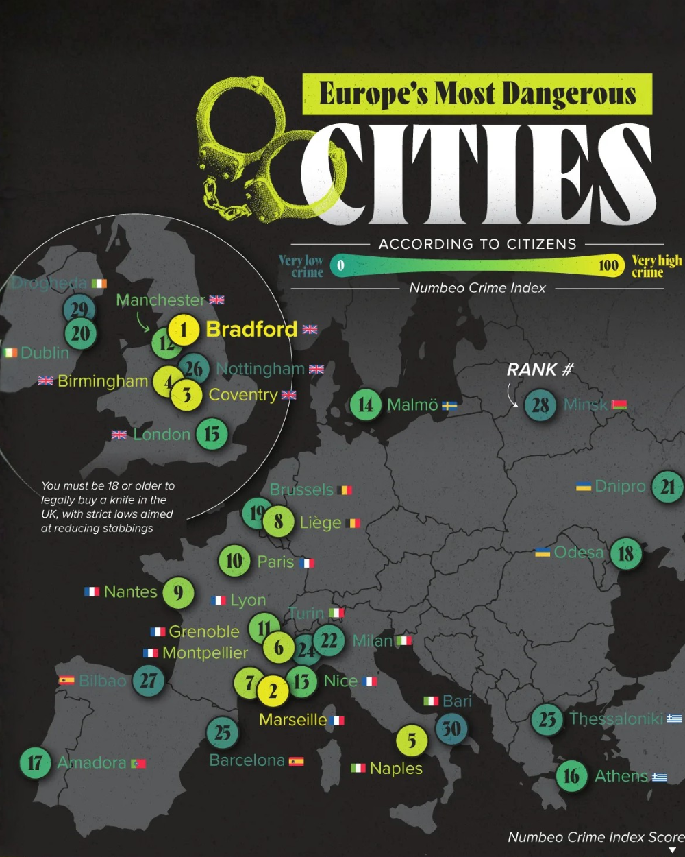 В топ-10 самых опасных городов Европы входят три города Великобритании, пять городов Франции, по одному — Италии и Бельгии. В Британии отмечается рост преступлений с применением ножей, а французские города, включая Марсель и Париж, сталкиваются с уличными кражами и локальными проблемами бедности.