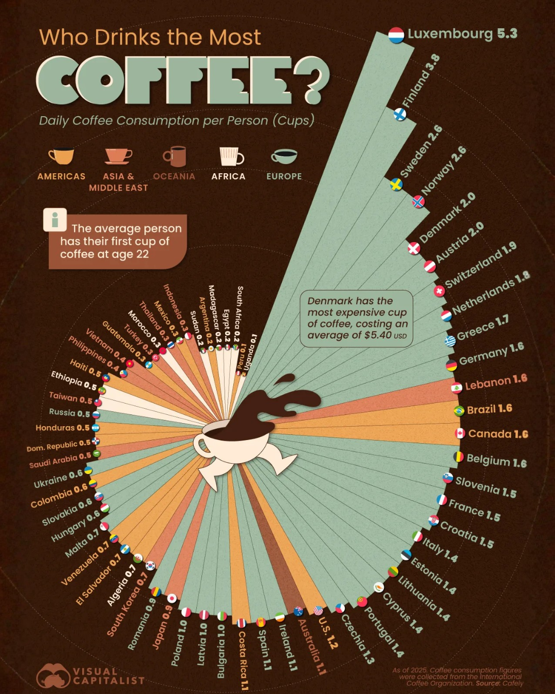 Согласно данным исследовательской компании Cafely за 2025 год, Люксембург возглавляет рейтинг с 5.31 чашки в день на человека. В статистику включены не только жители страны, но и работники, ежедневно приезжающие из соседних государств (Бельгия, Франция, Германия), что увеличивает показатель потребления на душу населения. За Люксембургом следуют Финляндия (3.77 чашки) и Швеция (2.59). Все 10 лидеров — европейские страны, что отражает традиции и покупательную способность.