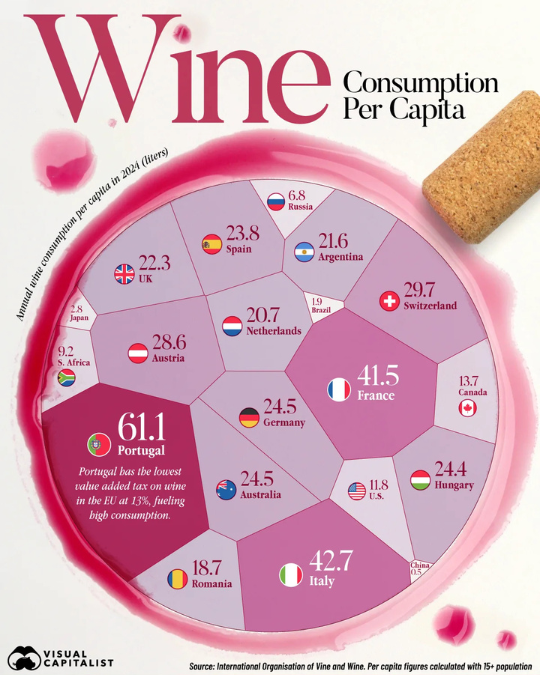Первое место занимает Португалия — здесь в среднем потребляют более 60 литров вина на человека в год. Высокий показатель объясняется доступностью местного вина и его устойчивым присутствием в рационе.