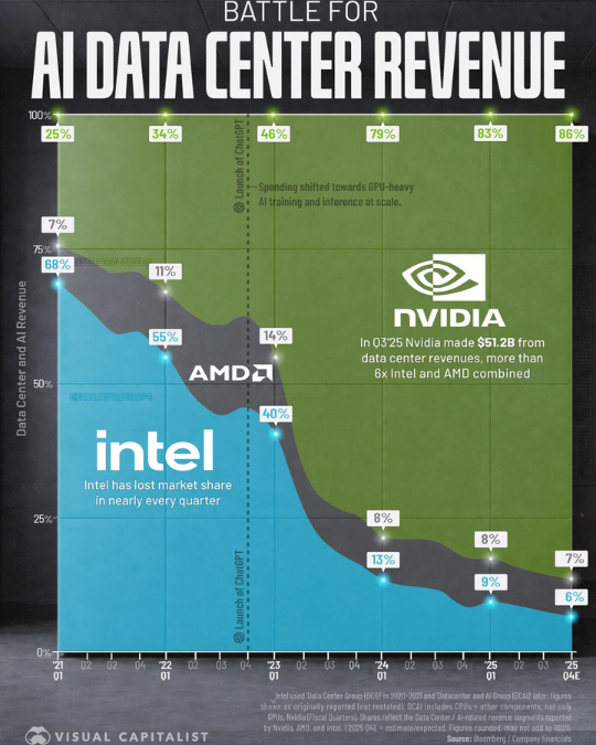 К 2025 году структура рынка полностью изменилась. Nvidia стала абсолютным лидером с долей около 86%, AMD вышла на второе место с 7%, а Intel опустилась на третью позицию с 6% рынка. Рост Nvidia объясняется не только более мощными GPU, но и платформенным подходом: компания одновременно развивает чипы, сети и программное обеспечение, из-за чего переход на альтернативные решения становится сложным.