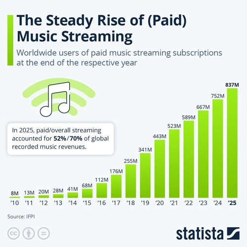 За 2025 год число пользователей платного музыкального стриминга выросло на 85 млн. и достигло 837 млн. человек. За последние 15 лет рынок рос почти без остановки, а при нынешних темпах уже через 2–3 года число платных подписчиков может превысить 1 млрд.