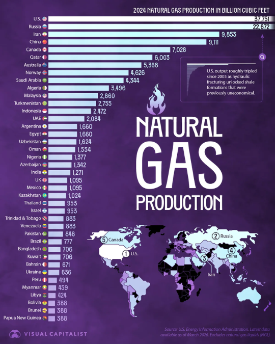 По данным Управления энергетической информации США, объем добычи в США достиг 37 751 млрд. кубических футов. На втором месте находится Россия (22 672 млрд.), на третьем — Иран (9 853 млрд.), на четвертом — Китай (9 111 млрд.). Замыкает пятерку лидеров Канада с 7 028 млрд. кубических футов.