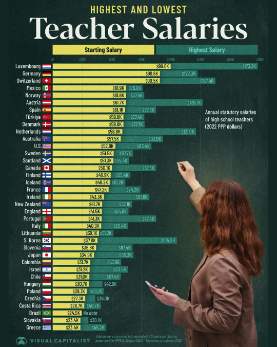 По данным отчета Education at a Glance 2025 Организации экономического сотрудничества и развития (ОЭСР), в странах, входящих в организацию, средняя максимальная зарплата учителя старших классов составляет около 76 тыс. долларов в год (по паритету покупательской способности). Однако в ряде стран этот уровень превышается более чем вдвое.