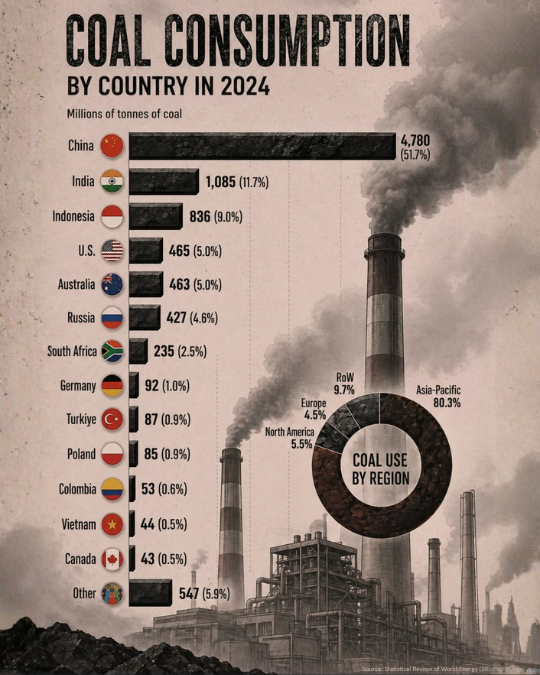 По данным Statistical Review of World Energy 2025, более половины этого объема приходится на Китай (51.7%) . Страна использует около 4.78 млрд. тонн угля в год.